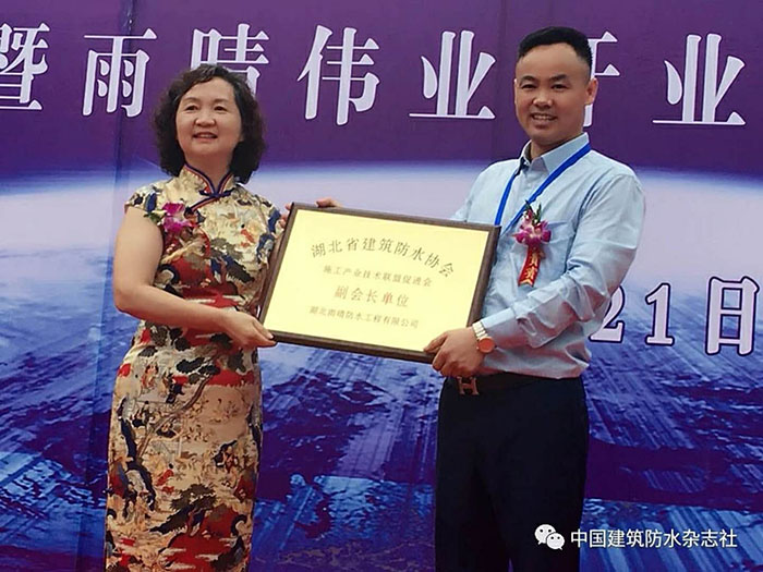 隨后,湖北防水協(xié)會會長桂春芳女士代表湖北防水協(xié)會在開業(yè)慶典大會上發(fā)表重要講話,她對湖北雨晴由最開始的施工企業(yè)轉(zhuǎn)型為防水系統(tǒng)服務(wù)商的工程進(jìn)行了簡要介紹,并對之前雨晴承接的眾多國家大型、重點(diǎn)項目的防水工程予以肯定,并對雨晴在湖北乃至華中地區(qū)較高知名度,美譽(yù)度,影響力予以了肯定。她還說:當(dāng)前,高質(zhì)量發(fā)展是新時代的要求,也是防水行業(yè)新時代的使命,并希望雨晴集團(tuán)在產(chǎn)品質(zhì)量、工程質(zhì)量和服務(wù)質(zhì)量的管理上進(jìn)一步做深做透做細(xì),日益精進(jìn)。心無旁騖造產(chǎn)品、一絲不茍干工程、全心全意做服務(wù),使雨晴集團(tuán)快速進(jìn)入高質(zhì)量高效益發(fā)展的康莊大道。之后授予雨晴公司“湖北省建筑防水協(xié)會施工產(chǎn)業(yè)技術(shù)聯(lián)盟促進(jìn)會副會長單位”。