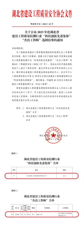 祝賀!市政設(shè)計院所屬路源公司及員工榮獲2023年度湖北省建設(shè)工程質(zhì)量檢測行業(yè)“科技創(chuàng)新先進集體”、“杰出工程師” 稱號。
