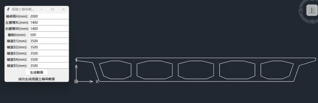 ? ? 武漢市政院實踐了多模態(tài)技術(shù)融合路徑——依托DeepSeek大模型深度工程語義理解與智能代碼生成框架,將混凝土箱梁截面的幾何參數(shù)標(biāo)準(zhǔn)、CAD二次開發(fā)規(guī)范等專業(yè)知識注入大模型認知體系,使其生成代碼框架。經(jīng)過多輪調(diào)試,開發(fā)出參數(shù)化生成混凝土箱梁截面的小插件,能夠?qū)崿F(xiàn)箱梁高度、懸臂長度、腹板寬度、箱室寬度等參數(shù)的設(shè)定,并配備可視化界面。