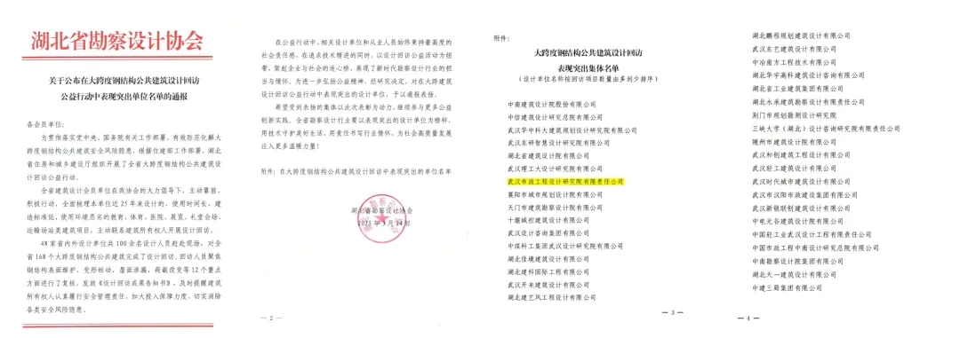 近日,湖北省勘察設(shè)計(jì)協(xié)會(huì)發(fā)布《關(guān)于公布在大跨度鋼結(jié)構(gòu)公共建筑設(shè)計(jì)回訪公益行動(dòng)中表現(xiàn)突出單位名單的通報(bào)》,武漢市政院憑借高度的社會(huì)責(zé)任感與卓越的專業(yè)貢獻(xiàn),榮列通報(bào)表揚(yáng)名單,成為全省勘察設(shè)計(jì)行業(yè)的標(biāo)桿典范。