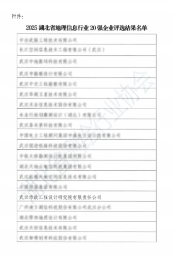 近日,從湖北省測(cè)繪行業(yè)協(xié)會(huì)傳來喜訊,武漢市政院憑借卓越的技術(shù)實(shí)力與行業(yè)貢獻(xiàn),成功獲評(píng)“2025湖北省地理信息行業(yè)20強(qiáng)”。這一榮譽(yù)標(biāo)志著公司在測(cè)繪地理信息領(lǐng)域的專業(yè)能力獲得省級(jí)權(quán)威認(rèn)可,為企業(yè)發(fā)展里程碑再添濃墨重彩。