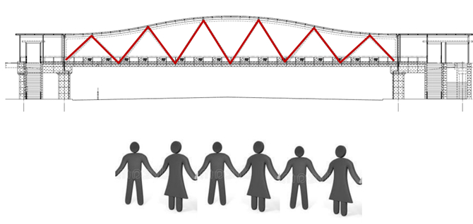 天橋采用充滿韻律感的變截面鋼桁架結(jié)構(gòu),形成多個(gè)人字形桁架梁,象征著全國人民手挽手肩并肩,精誠團(tuán)結(jié)共同戰(zhàn)勝新冠病毒。
