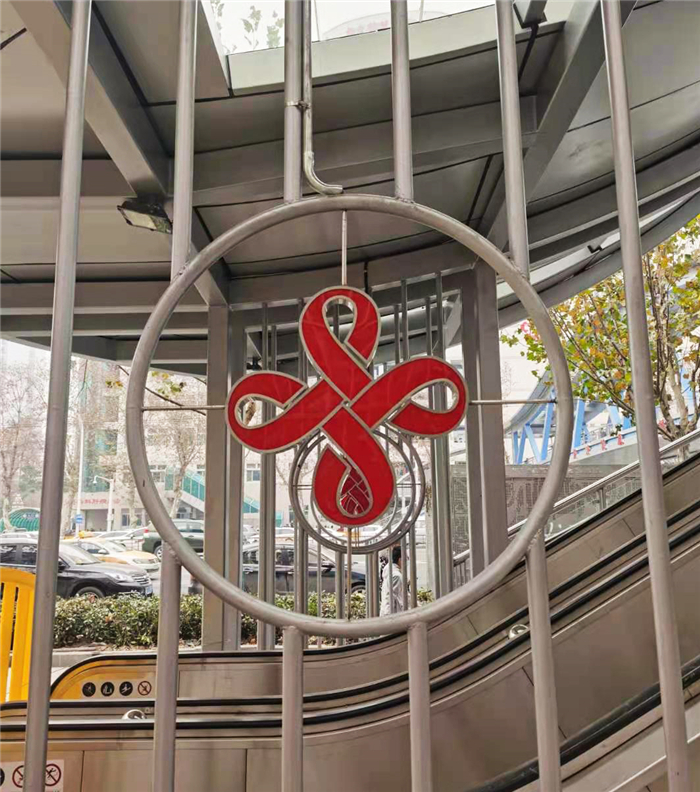 在天橋梯道及自動(dòng)扶梯入口處、橋下休憩區(qū)設(shè)計(jì)醒目的紅色標(biāo)識(shí),將中國結(jié)與紅十字融為一體,象征博愛、奉獻(xiàn)精神的白衣天使與武漢人民永結(jié)同心,中國結(jié)寓意著美好、吉祥、安康。