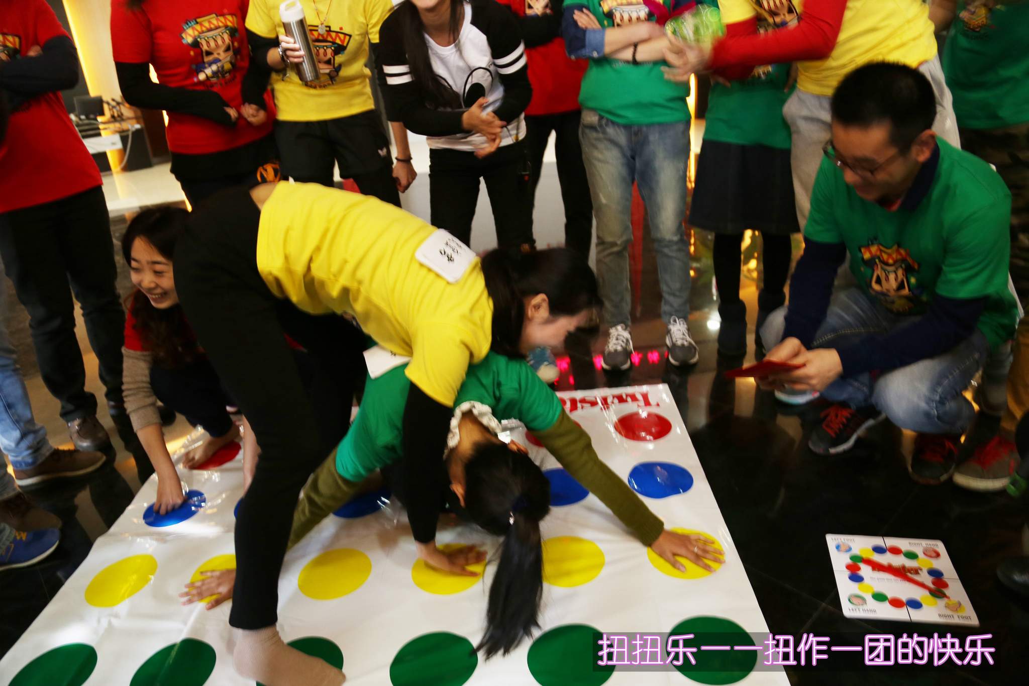 ??? 第四個(gè)環(huán)節(jié)是扭扭樂,每隊(duì)個(gè)派出一名隊(duì)員,根據(jù)主持人指針旋轉(zhuǎn)選定的顏色決定手腳需放置的位置,如站立不穩(wěn)或無色塊可放時(shí)即遭淘汰。最終,黃隊(duì)在這個(gè)考驗(yàn)身體柔韌性和協(xié)調(diào)性的環(huán)節(jié)中勝出,同樣獲得了一個(gè)錦囊。