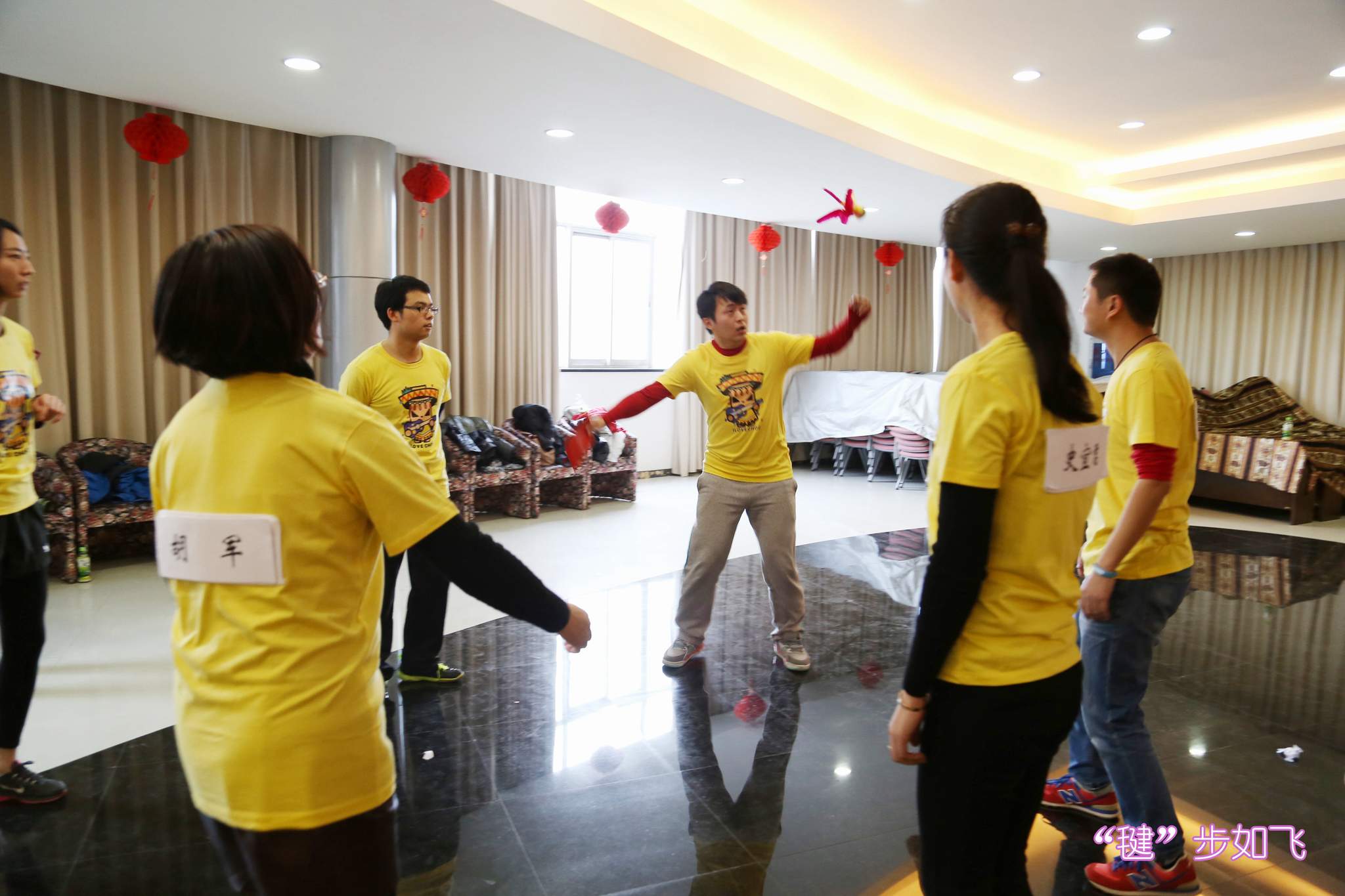 ??? 第五個(gè)環(huán)節(jié)是踢毽子,七名隊(duì)員要讓毽子在本隊(duì)中進(jìn)行15次傳接,單人連續(xù)多次踢毽子只算作1次,至少有3名隊(duì)員要踢到毽子,這也是所有游戲環(huán)節(jié)中難度最大的一個(gè),有的隊(duì)伍在傳接了14次后沒有接好最后一次,功敗垂成。最終,黃隊(duì)首先完成,成功獲得1個(gè)錦囊。
