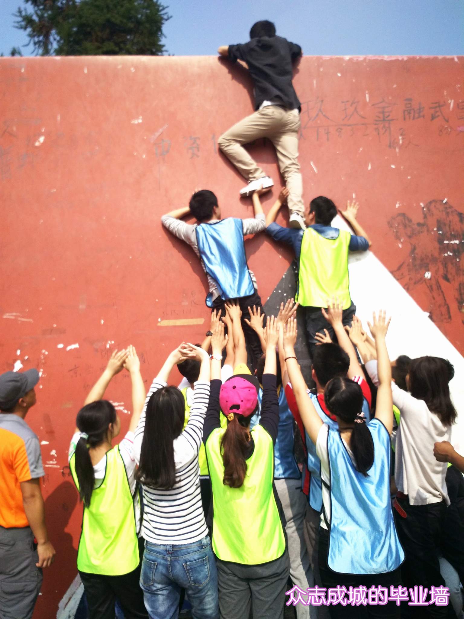 ??? 在最后的“畢業(yè)墻”環(huán)節(jié),大家團(tuán)結(jié)一心,幾名隊(duì)員先是搭起了雙層人梯,將幾名隊(duì)員率先送上去,剩下的隊(duì)員借助人梯,上面的隊(duì)員也是又拉又拽,很快,二十幾名隊(duì)員便全部成功登頂。