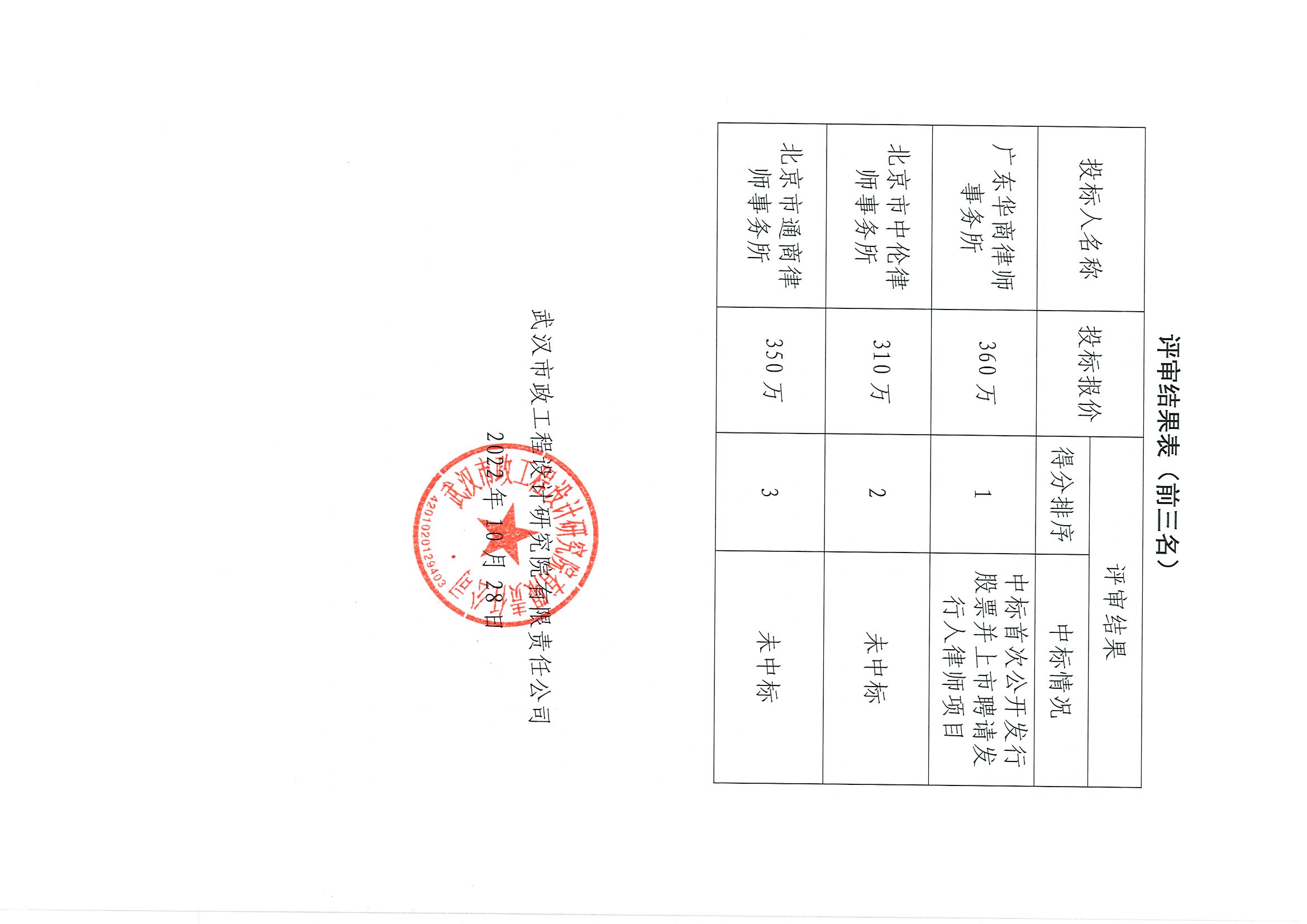 武漢市政工程設(shè)計(jì)研究院有限責(zé)任公司首次公開發(fā)行股票并上市聘請發(fā)行人律師項(xiàng)目招標(biāo)結(jié)果的公示